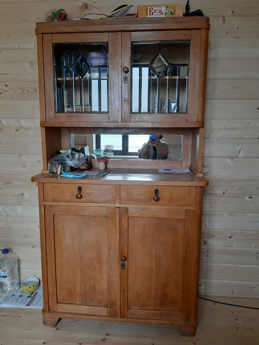 Доброго времени суток, уважаемые читатели. Надеюсь вам понравилась моя предыдущая переделка комода. Сегодня я хочу продолжить свое повествование, про то как обставить дачу бюджетно. В этом посте расскажу вам про переделку буфета. Небольшое предисловие. Когда я была маленькой, я приехала летом на дачу к своей тёте. Там стоял огромный буфет с зеркалом. Огромным он мне казался, потому что я была крохотной. На буфете стоял смешной китайский болванчик с качающейся головой. Я вставала на цыпочки и смотрела в зеркало буфета. Прошло много времени, я выросла, у меня своя дача, и я всегда хотела такой буфет из своего детства. После долгих поисков на авито я его нашла (что бы не дорого и не совсем убитый). Сначала он жил в нашей квартире, а потом поехал по месту постоянного проживания – на дачу. Я долго не понимала каким хочу его видеть. Долго выбирала краску. На моем любимом «Joom» заказала деревянные украшения для дверей и мебельные ручки. И вот краска куплена, посылка пришла, и началось пре