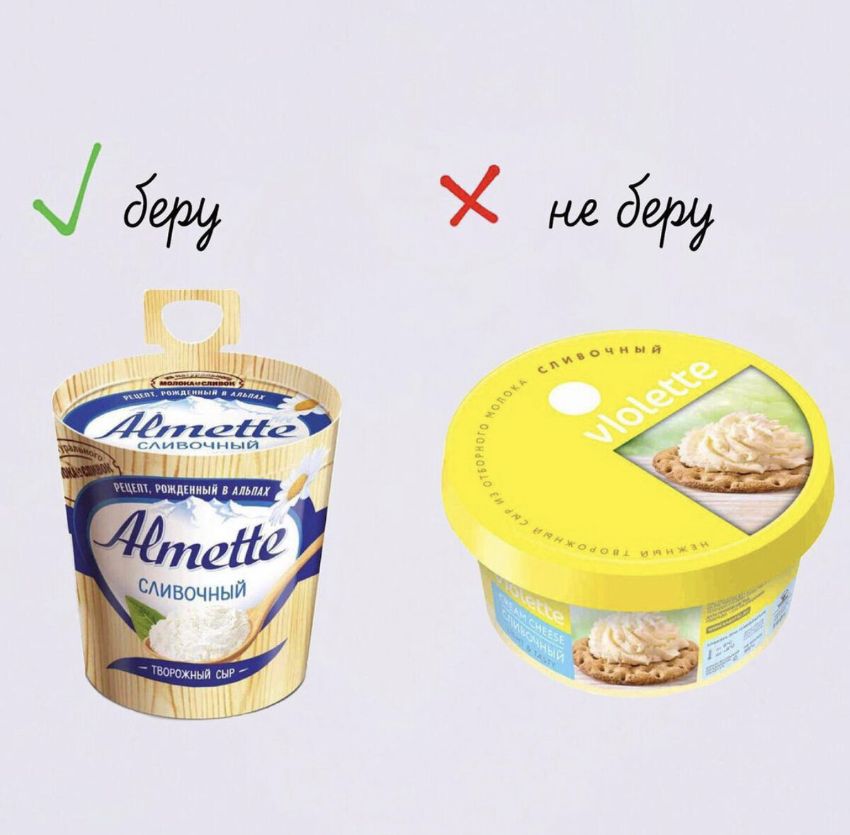 РАЗБОР СОСТАВОВ ТВОРОЖНОГО СЫРА😋 рубрика #беру-не беру ❗️ Я не навязываю определённых производителей, и не ставлю под запрет других, я всего лишь на примерах хочу показать более здоровые альтернативы продуктов и учу вас разбираться в составах 🤗 По просьбе сегодня разбираю состав творожных сыров 😊 хочу сказать, что почти у всех творожных сыров на самом деле неплохие составы, потому что такой сыр очень очень просто делается, в составе смотрим чтобы не было различных добавок ✅ творожный сыр Альметте. Коротенький состав: творог, сыворотка, белок, лимонка, соль. Консервантов нет, сахара нет, химозы лишней нет, что ещё нужно для счастья? 😄 берём ✅ ❌ творожный сыр Violette. Ну не прям критичный состав, но присутствует сахар, стабилизаторы, мальтодекстрин. Зачем они там? Из этих вариантов лучше отдавать предпочтение первому) ❌