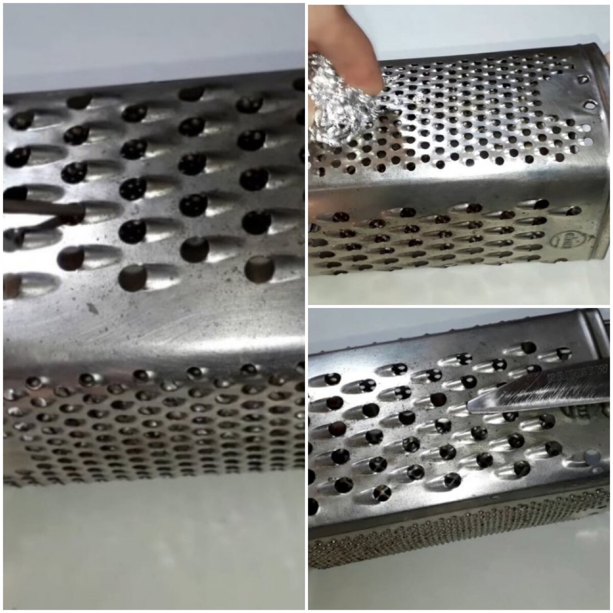 2. Второй способ – это использование фольги. Особенно будет уместно применение на стороне для мелкого натирания. Берём обычную фольгу, скатываем в шарик и тщательно натираем со всех сторон .