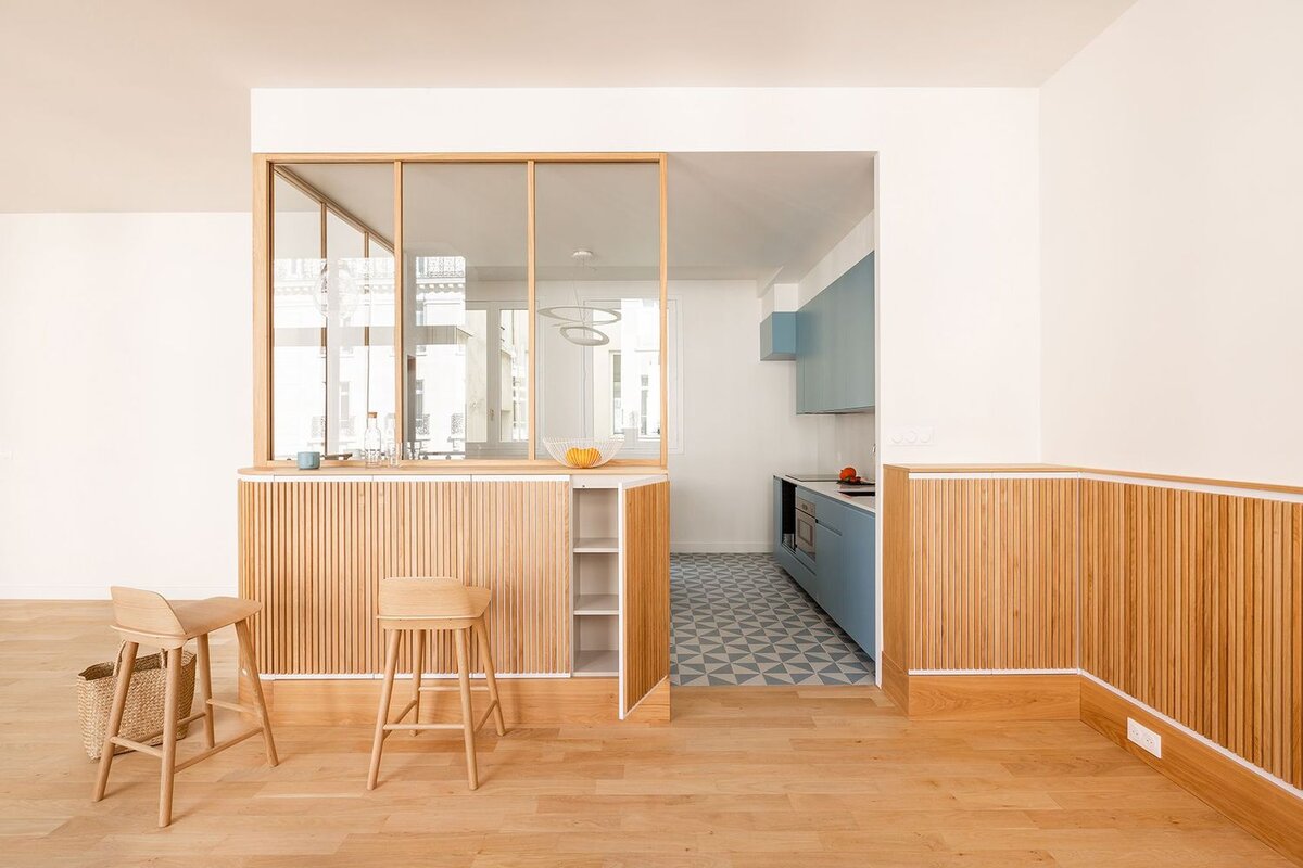 Студия Bertina Minel Architecture переосмыслила пространство квартиры в центре Парижа, чтобы сделать ее комфортным для жизни современной семьи Эта трехуровневая квартира, расположенная в самом сердце Парижа, не ремонтировалась десятки лет, прежде чем ее владельцы не обратились к студии Bertina Minel Architecture с просьбой обновить интерьер. Основной задачей команды было реорганизовать пространство площадью 235 кв.м, чтобы адаптировать его к потребностям новых хозяев. Снос некоторых перегородок помог впустить естественный свет, который теперь наполняет квартиру в течение всего дня. Такое решение создало эффект плавно перетекающего пространства и позволило лучше распределить зоны для работы отдыха и приема гостей. Кроме того, дизайнеры восстановили связь между уровнями, открыв большое окно, простирающееся на два этажа. На первом этаже находится общая зона, состоящая из гостиной, кухни и столовой. На втором этаже детские спальни объединены с игровой, откуда открывается вид на гостиную. Т