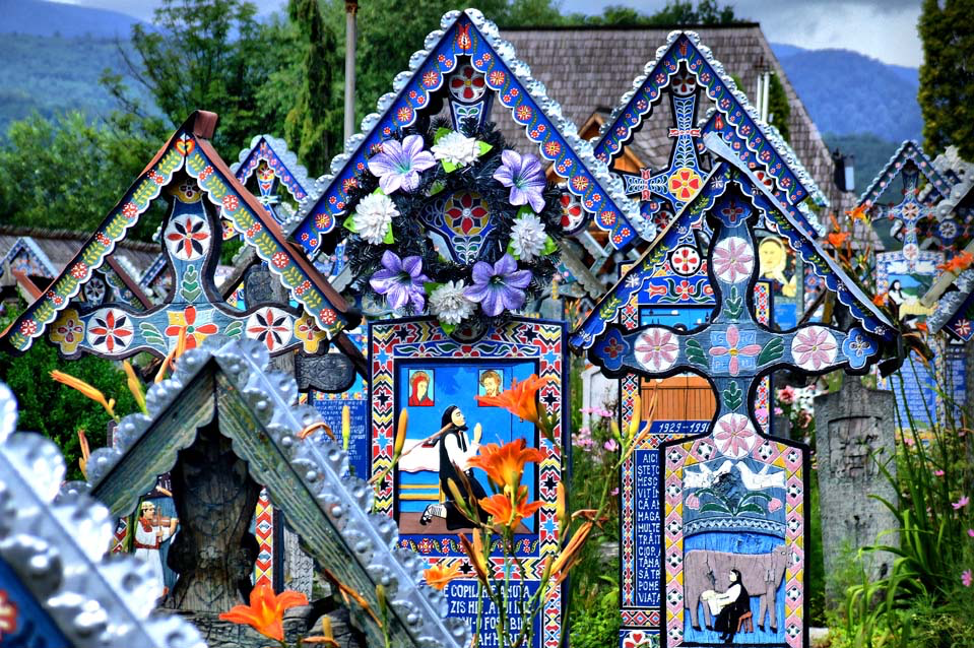 В румынской деревеньке Сэпынца по-особенному относятся к смерти, поэтому кладбище и стало знаменитым на весь мир. Все атрибуты похорон в европейском мире достаточно традиционны — надгробия и кресты выполняются в строгом соответствии с правилами: фотография и эпитафия. Но в румынской Сэпынце получилось иначе: здесь высится более восьми сотен забавных и необычных синих крестов, на которых вырезаны события из жизни похороненных здесь людей. Все началось в 30-х годах XX века, когда мастер Стан Йон Пэтраш начал создавать кресты с ироничными надписями о почивших односельчанах. Частенько он вырезал из дерева момент смерти усопшего, если тот был особенно примечателен. Текст одного из надгробий: Чуйка (румынская фруктовая водка. — Прим. ред.) — чистый яд, Она приносит слезы и мучения. Именно это принесла она и мне. Смерть придавила меня своей ногой. Тот, кто любит чуйку, закончит как я, Потому что я любил чуйку, я встретил смерть с нею в руке. Пэтраш разработал собственный стиль, в котором кажд