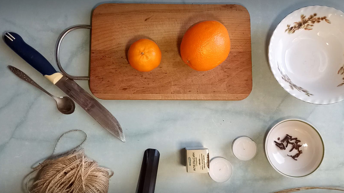 Цитрусовый аромат с детства ассоциируется с радостной предновогодней суетой, тёплыми эмоциями семейного торжества. Очистив очередной фрукт, я каждый раз думала, какое бы применение найти этой кожуре. Внезапно ко мне пришла идея сделать из неё экологичные подсвечники. Яркие декоративные элементы из апельсиновой и мандариновой шкурки, насыщенной эфирными маслами, помогут продлить праздничную атмосферу, наполнив дом уютом. Оригинальные украшения из цитрусовой кожуры можно сделать быстро и дёшево своими руками. На удачу у меня было несколько обычных свечей. Они удобны в работе, ведь воск можно легко расплавить в домашних условиях. Материалы, которые понадобятся для работы: У меня было 2 мандарина и апельсин. Из мандаринов сделаем ароматные подсвечники. Для этого срезаем верхушку фрукта и аккуратно удаляем мякоть ложкой. Перекладываем её в тарелку. Ничего не выбрасываем, нам всё пригодится. Апельсин разрезаем пополам и также очищаем. У хозяйственной свечи отрезаем верхушку с фитилём по высо