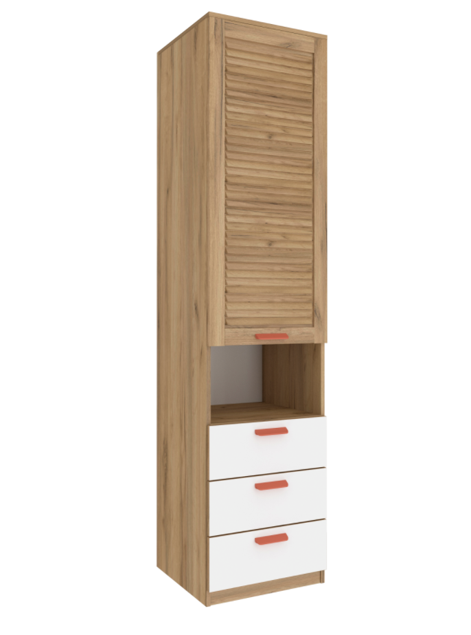Первые представляют собой вертикальные высокие и довольно узкие (около 50–60 см) конструкции. Обычно их подбирают в комплект к стенкам или горкам.