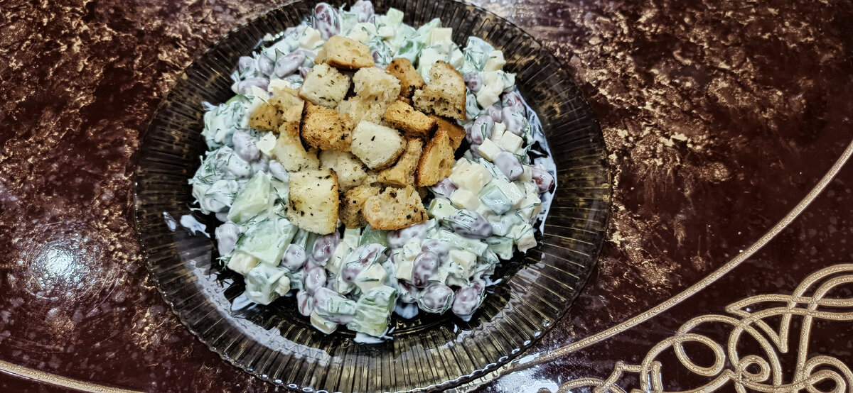 Доступный салат с фасолью,огурцами ,сыром и сухариками.