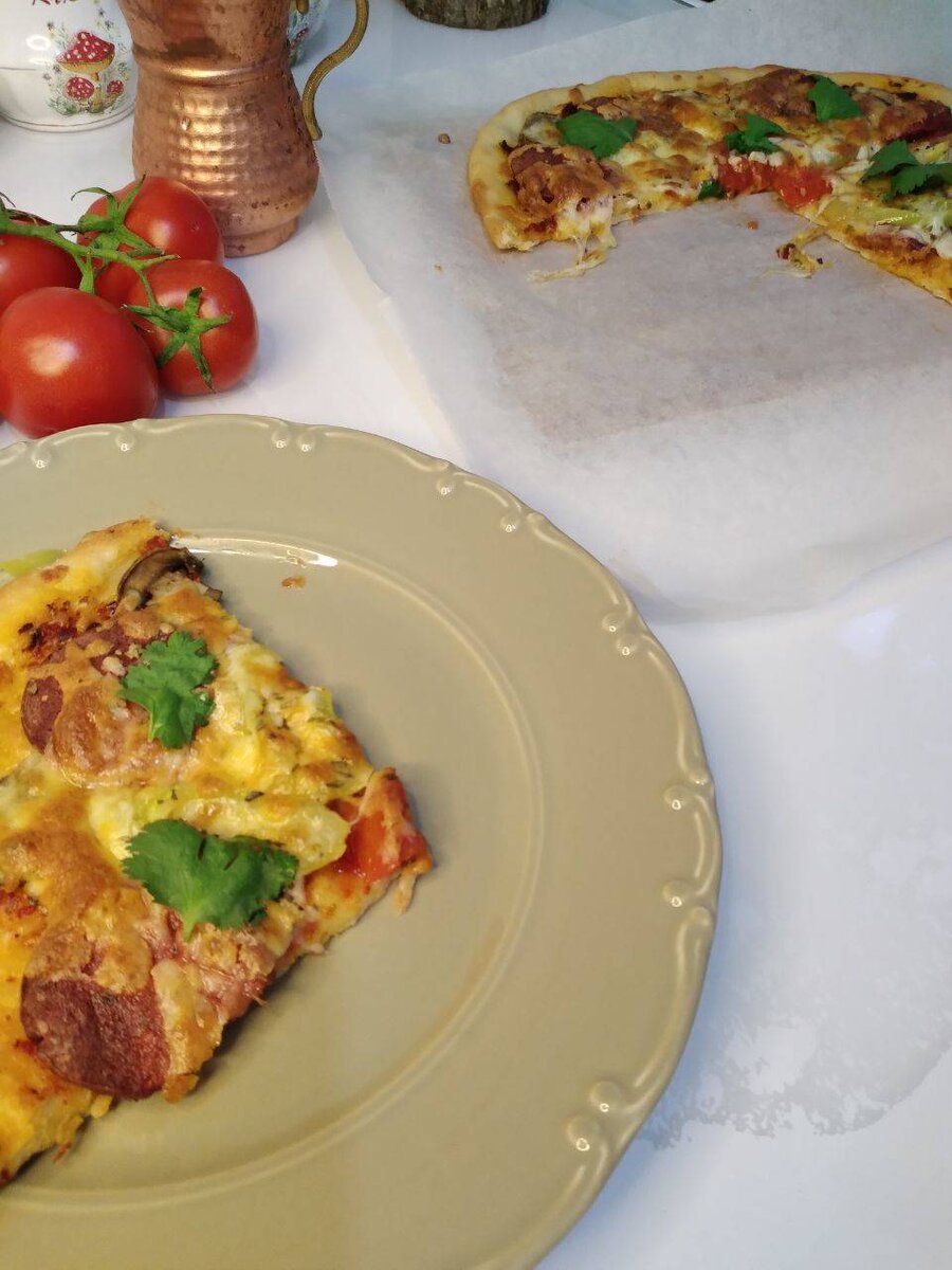 Здравствуйте, девочки! На выходные приготовила пиццу с суджуком, грибами, перцем и сыром. Получилась очень вкусная поэтому решила поделиться с вами. Ингредиенты: вода тёплая, мука, сахар , соль, дрожжи сухие, оливковое масло , Для начинки:, томатная паста, Суджук, Твёрдый сыр, Зелень , Грибы, перец и помидор Способ приготовления: В тёплую воду добавить соль, дрожжи и оливковое масло, просеять часть муки. Перемешать и добавить ещё часть муки. Замесить тесто выложить на стол и тщательно вымесить в течение 7-10 минут. Поделите на части, раскатайте тонкий круг или как я ( Можно руками) и выложите начинку. Приготовим начинку: Помидоры, сыр я использовала твёрдый, сладкий перец, грибы, помидоры и суджук нарезаем тонко. Для соуса использовала: 2 ст.л томатной пасты 1 ст.л барбекю соуса 1 ст.л растительного масла и орегано (с ней получается очень вкусно) Духовку разогрейте заранее за 30-40 минут до 200 градусах. Готовьте и наслаждайтесь! Всем приятного аппетита!