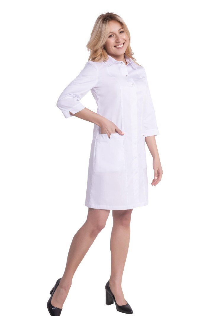 Женский медицинский халат, полуприлегающего силуэта, с разрезами в боковых швах и застежкой по борту на кнопки. Горловина обработана отложным воротником с отрезной стойкой. Перед с рельефами от плечевого шва до низа изделия. В отрезных бочках расположены боковые карманы с притачными планками. На левой полочке в рельефном шве расположена пата для бейджа. Спинка отрезная ниже линии талии, обработана притачным поясом. Рельефы проходят от плечевого шва до линии отрезного пояса. Рукава втачные, одношовные. Имеют три длинны: короткий; ¾ и А. Короткий рукав и ¾ по низу обработаны притачной манжетой. Состав ткани: Экстра (55% хлопок, 42% полиэстр, 3% эластан) Плотность ткани: 150г/м2 Размерный ряд: с 40 по 54 Рост: 164/170 В интернет-магазине медицинской одежды вы можете приобрести современную удобную одежду для медицинского персонала. Для приобретения медицинской одежды оптом вы можете оставить заявку на нашем сайте или обратиться к нашим менеджерам по телефону 8-800-250-37-60.