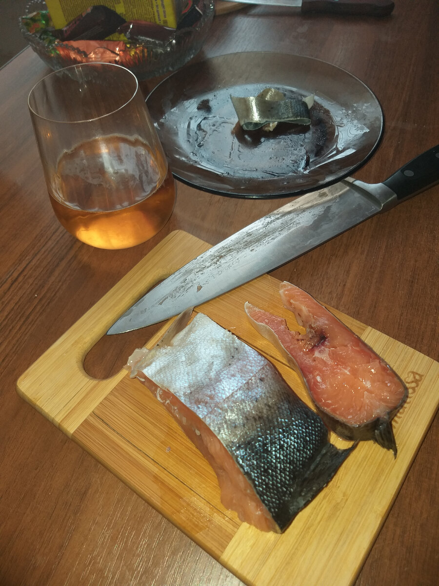 Покупаем в магазине замороженную красную рыбу. Совсем бюджетный вариант горбуша, дороже форель. Всё равно это будет в несколько раз дешевле, чем те вакуумные пакетики со слабосоленым кусочком рыбки. И в несколько раз свежее.