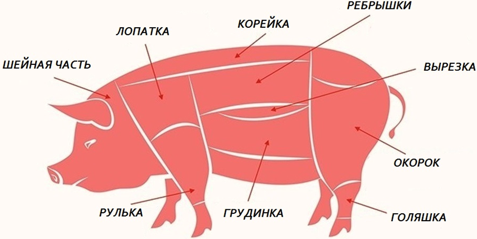 Всем привет!))) Часто задают вопрос: «Что приготовить из свинины?» … К сожалению, многие даже не знают, какая часть разделки из хряк-хряка перед тобой лежит))) Схема разделки свиной туши: Шейная часть - жарим, запекаем, варим супы. Это очень нежное, сочное мясо, которое содержит (100 грамм): Белки 13,6 г Жиры 31,9 г Углеводы 0 г 343 ккал Витамины: В1, В2, В3, В4 и В12 Минеральные вещества: ФОСФОР, СЕРА, ЦИНК,МОЛИБДЕН. Лопатка –запекаем, жарим, тушим, варим. Бескостное мясо очень жесткое, используется для приготовления колбас, холодцов. Также можно тушить, варить, жарить. Лопатка на кости, тоже жесткое мясо, лучше всего используется порционными кусками или целиком коптим, или запекания. Содержит (100 грамм): ккал: 257 Белки, г: 16.0 Жиры, г: 21.7 Углеводы, г: 0.0 Витамины: В1,В2,В12, В5, В9. Минеральные вещества: МАГНИЯ, КАЛЬЦИЯ, НАТРИЯ, КАЛИЯ, ФОСФОР, ХЛОРА. Корейка – запекаем, жарим, варим. Очень нежное, вкусное и ароматное. Содержит (100 грамм): ккал: 384 Белки, г: 13.7 Жиры, г