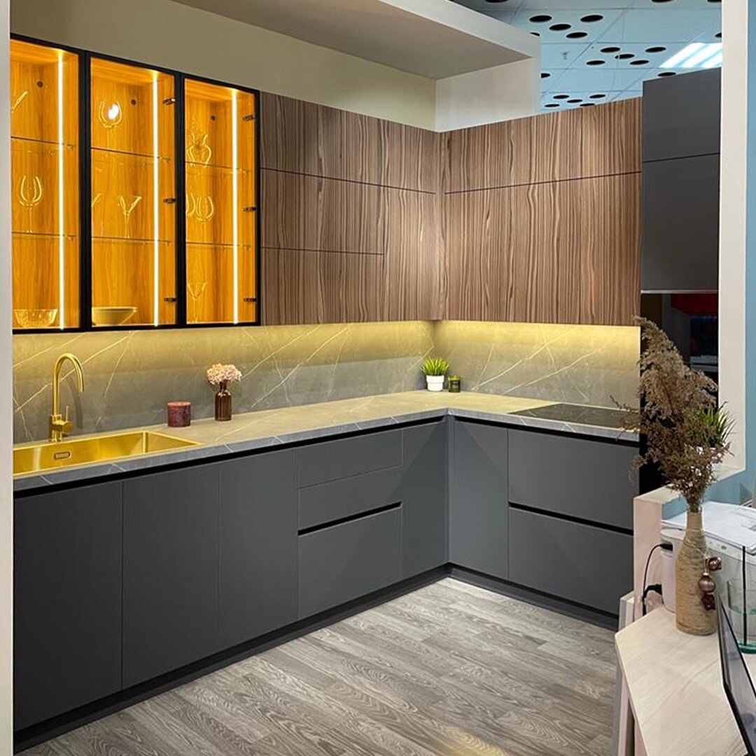 В нашей коллекции декоров шпона шире, чем орех, представлен только дуб. В программе натурального шпона пальму первенства по популярности делят между собой именно дубы (европейский и Retro) и орех американский. А в программе шпона ALPI лидируют два ореха и один дуб. Самый популярный шпон среди наших заказчиков – орех волнистый (119 РТ). Представляем примеры использования фасадов в шпоне орех волнистый в кухонном гарнитуре. Кухни с ореховым вкусом! 1. Кухня с верхними модулями в шпоне Орех волнистый Текстура шпона расположена по высоте фасада, делая модули визуально еще выше. Хотя проект и так предусматривает модный сейчас вариант верхних шкафчиков «под потолок». Вытягивающую линию создает не только направление текстуры шпона, но и подбор рисунка когда линия плавно переходит с одного фасада на другой. Выглядит очень гармонично. Хотелось бы подчеркнуть универсальность цвета шпона Орех волнистый. В первом проекте он скомбинирован с деталями кухни интерьера, окрашенными в благородный серый