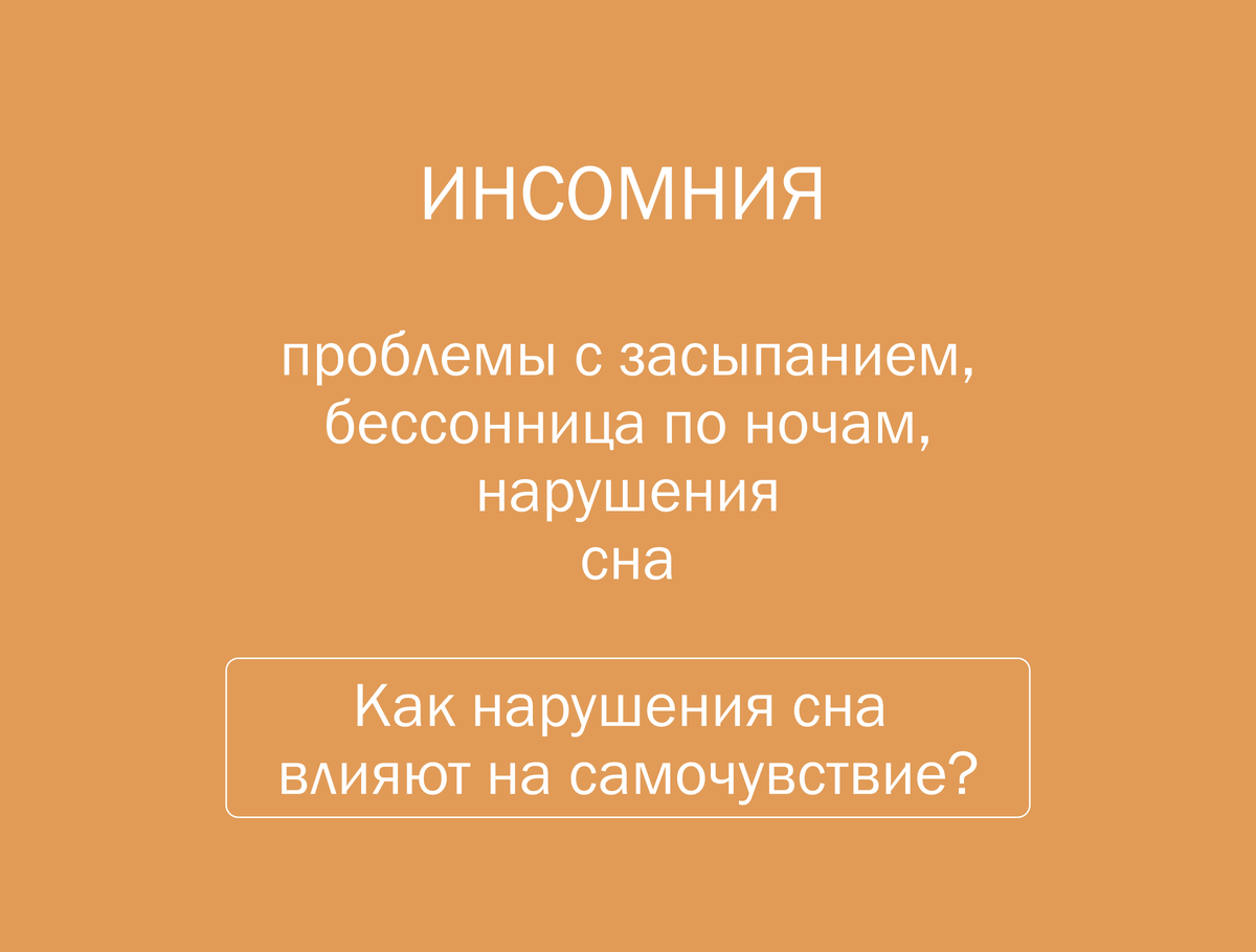 Замечали, что долго засыпаете или часто просыпаетесь по ночам? Если нет, то все отлично: у вас абсолютно здоровый сон. Однако если вы часами ворочаетесь в кровати и утром встаете разбитым, это может быть симптомом серьезных нарушений в организме. Инсомния – это состояние, при котором происходят сбои в цикле сон-бодрствование: долгое засыпание, частые ночные пробуждения, поверхностный сон, кошмары ухудшают качество и количество сна. В результате человек спит меньше нормы и не может полноценно отдохнуть из-за отсутствия глубокой фазы сна. Нарушения сна делятся на 3 группы: ♦ человек не может уснуть более получаса: у него пропадает желание спать, как только он ложится в кровать,он долго ищет удобную позу и не может избавиться от негативных мыслей в голове; ♦ человек часто просыпается ночью из-за кошмаров, позывов в туалет, учащенного сердцебиения, посторонних шумов, света и других раздражителей; ♦ человек с трудом просыпается утром и испытывает чувство усталости, рассеянности, апатию и го