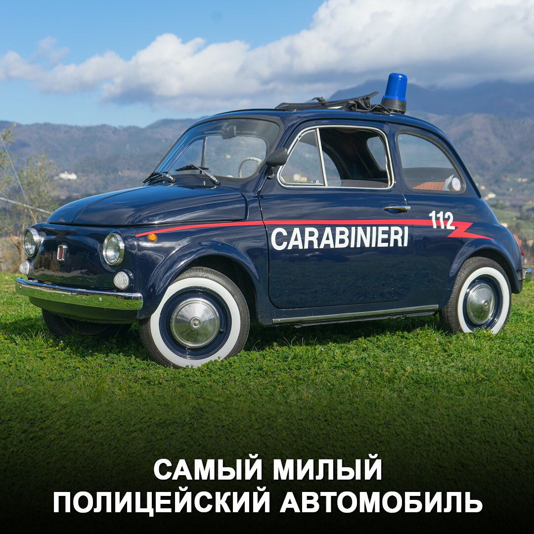 Этот Fiat 500 1970 года служил патрульным автомобилем в корпусе итальянских карабинёров. У него оппозитный двухцилиндровый мотор объёмом 499 «кубиков» с воздушным охлаждением, который выдаёт 18 л.с. КПП — 4-ступенчатая механика. Первую сотню такой автомобиль набирает примерно за 35 сек., из комфортных опций в салоне — только мягкая откидная крыша. Зато Fiat 500 был очень проворен на узких улочках итальянских городов. Да и вообще, разве захочется убегать от такого милахи? 😅 #дромтачкадня #италия #fiat #500 #полицейскийавтомобиль