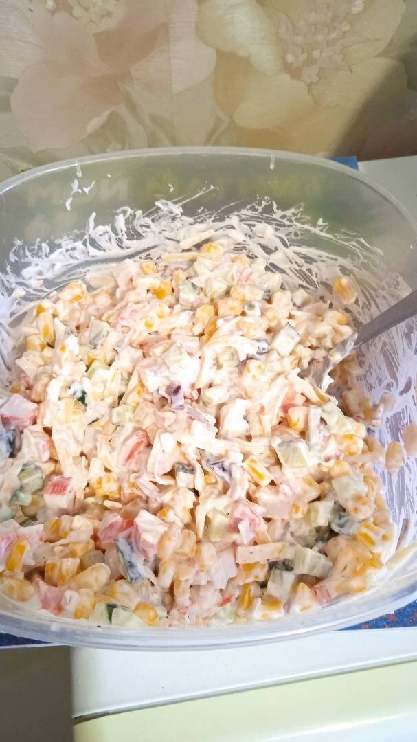 Мой муж не ест яйца и не очень то любит рис) Поэтому я всегда готовлю ему такой крабовый салат) Мужу очень нравится) Ингредиенты: Маленькая банка кукурузы, средний огурец, крабовых палочек, Небольшая красная луковица, тёртого сыра, Соль, перец, майонез Способ приготовления: С кукурузы слить сок и высыпать её в миску. Огурец нарезать мелким кубиком. Крабовые палочки нарезать средним кубиком. Сыр натереть на крупной терке. Лук нарезать мелким кубиком. Добавить по вкусу соль/перец и 2-3 ложки майонеза. Всё тщательно перемешать, добавить по желанию зелень. Приятного аппетита 😋