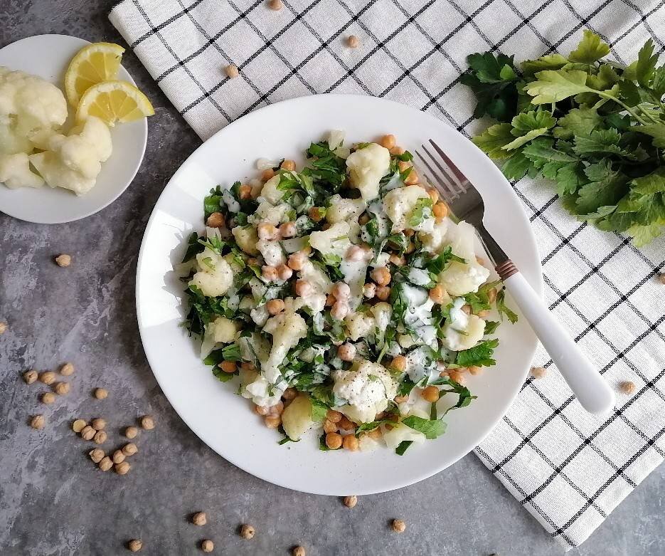 Ингредиенты: нута, цветной капусты, петрушки, оливковое масло, лимонного сока, соль и перец, Для заправки:, натурального йогурта, цедры лимона, сушеной мяты Способ приготовления: Нут промыть, отварить до готовности (инструкция и советы есть на упаковке). Цветную капусту опустить на 3 минуты в кипящую воду (у меня была замороженная). После остудить и разделить на небольшие соцветия. Петрушку вымыть, обсушить и нарубить. Смешать нут, цветную капусту и петрушку, полить смесью масла и лимонного сока, посолить и поперчить по вкусу. Смешать йогурт с цедрой, полить салат сверху.