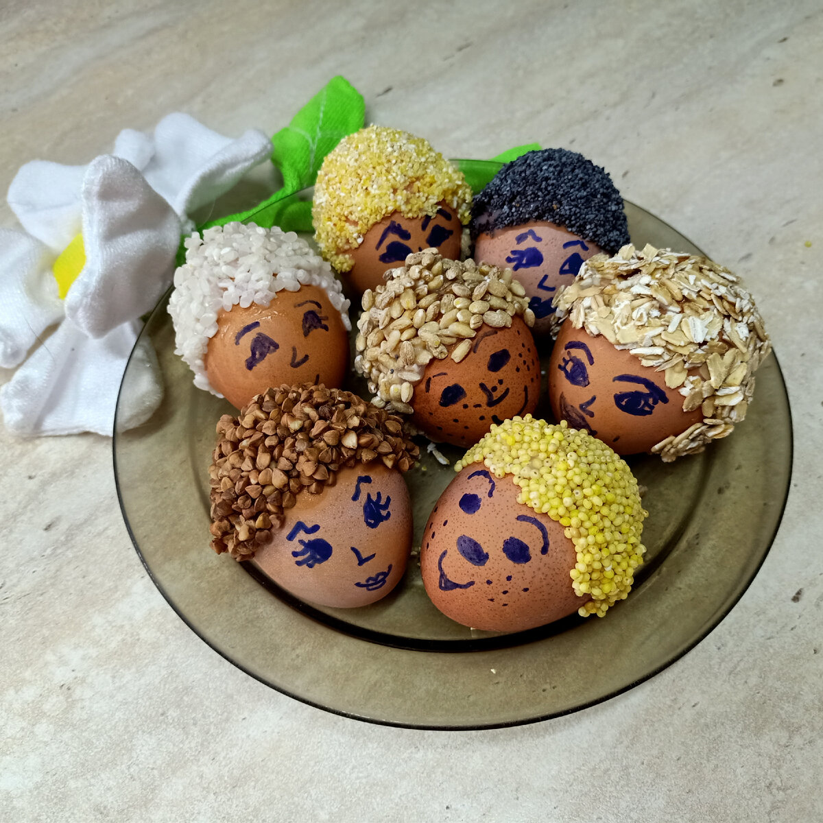 Даем остыть. Шаг 4 Вареные яйца макаем в клейстер или намазываем кисточкой и сразу окунаем в крупу. Шаг 5 Маркером или фломастерами рисуем рожицы. Шаг 6 Разрисованные яйца выкладываем на блюдо и подаем на праздничный стол.