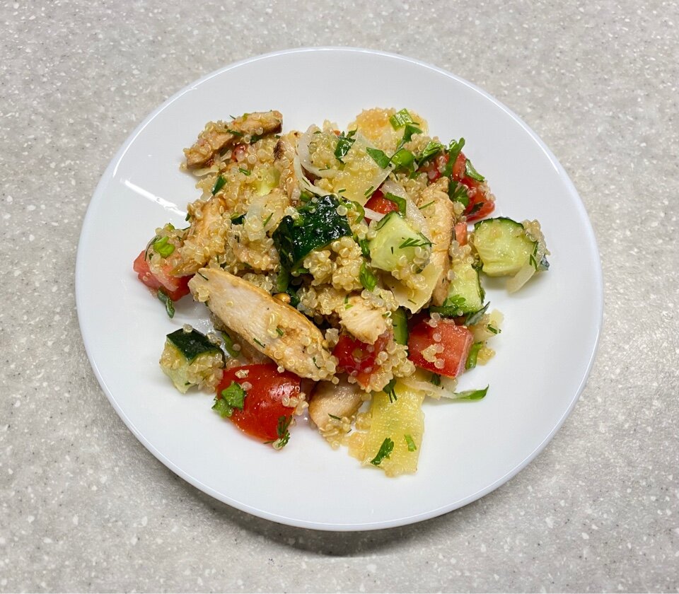 Легкий вечерний салатик, и достаточно прост в приготовлении. Что нам понадобится: 1. Киноа - 1/2 стакана 2. Куриное филе - 100-200 г. 3. Помидор - 1 шт. 4. Огурец - 1 шт. 5. Лук - 1/4 6. Зелень (у меня это зеленый лук, укроп и кинза) 7. Оливковое масло - 2-3 ст.л. Сначала подготовим все ингредиенты. Киноа хорошо промываем в холодной воде и ставим вариться. Я добавила в воду половинку куриного кубика, так мне вкуснее, но это не обязательно. Куриное филе обжариваем на сковороде до готовности, можно добавить приправы, солим и перчим. Остужаем и нарезаем пластинками. Помидор режем средними кубиками Такой же формой нарезаем огурец 1/4 лука режем перьями и маринуем в уксусе с водой. В среднем минут 15. Затем сливаем и хорошенько промываем водой. Меленько режем зелень Готовим соус. В оливковое масло добавляем специи, у меня это приправа для салата Цезарь. Когда киноа готово, начинаем собирать салат. Берем глубокую чашу, кладем в нее киноа и куриное филе Затем добавляем огурец, помидор,