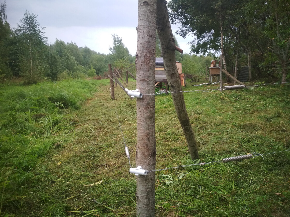 Здравствуйте, дорогие читатели! Давно я тут не появлялся, а время идет и появился опыт, которым я могу поделится с вами. Когда я сам искал информацию о защите пасеки от медведя, очевидных решений я не видел, приходилось придумывать многое самому. Что я понял из информации в интернете - защититься от медведя можно только электро-пастухом. Все остальные способы (шум, заборы, собаки, охрана с ружьем) - не помогают на 100%. При нападении на пасеку мишка обычно разносит сразу всё, в силу любопытства видимо. А что же в следующей коробочке, надо посмотреть... У меня вопрос назрел остро, мишка вынес точёк с несколькими ульями у моего коллеги в нескольких км от меня, я по сути был следующий... Пасека у меня стоит в деревне, но людей у нас мало живет (три дома), от дома ульи в 50 метрах за живой изгородью, у леса. Поставил я прожектор и музыку на ночь на пасеке, и стал делать столбики для электро-забора из осины толщиной 10см. Вкапывал я их с шагом 10 метров примерно, укреплял укосинами. Изолят