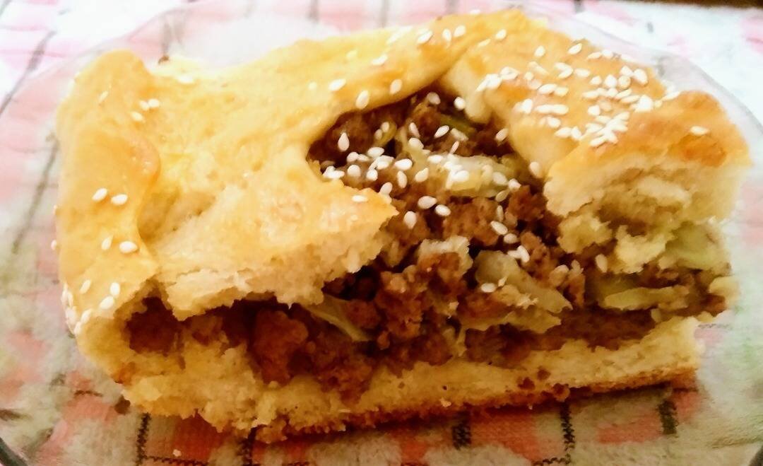 Как-то подзабылся старый рецепт. А тут раз, как находка! Каруста делает фарш сочным и легким. Попробуйте, очень вкусно! Ингредиенты: Тесто, теплой воды, сухих дрлжжей, сахара, муки, яйцо в тесто и 1 яйцо для смазывания (не обязательно), соли, масла растительного, Начинка, фарш мясной (говяжий), лук, капусты, масло для жарки Способ приготовления: Опара: смешать воду, сахар, дрожжи и 3 ст. л. муки. Поставить в теплое место на 15 минут. Я ставлю в микроволновку, включаю макс. режим на 1 минуту и оставляю опару там на 14 минут. В поднявшуюся опару добавляю, размешивая, остальные ингредиенты. Последнее - мука. Замешиваю тесто не круто и ставлю в микроволновку, как описано выше, на 30 минут. Пока подходит тесто, делаю начинку. Жарю фарш с луком, через 5-7 минут добавляю к нему порезанную капусту, соль, перец, специи по вкусу. Все вместе жарится до готовности. Затем фарш остудить. Тесто делю на 2 части: на нижнюю часть выкладываю начинку, затем покрываю верхним коржом. В этот раз сделала реше