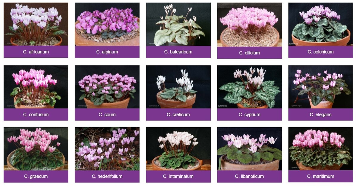 На иллюстрации ниже представлены все виды цикламенов по данным The Cyclamen Society (это Международное сообщество, объединяющее исследователей цикламенов).