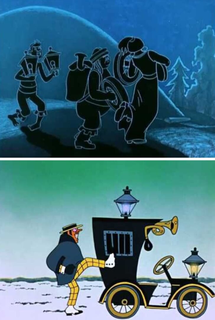 Разбойники, которые темной ночью выползают из города с песней «Чужие сапоги натерли ноги», тащат фонари, колеса и дудку. Их они явно сняли с автомобиля Сыщика.