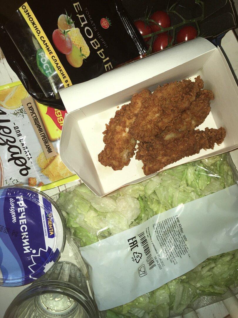 Покупаю: смесь Магги для салата Цезарь (в нее входит смесь для соуса и сухарики), томаты черри, греческий йогурт, салат айсберг, оригинальные стрипсы из KFC, либо шницель куриный рубленый от Петелинки (в этом случае его нужно предварительно приготовить в духовке, что занимает 30-40 минут)+ кипячу воду для соуса. Сыр не добавляю, но при желание, лишним он не будет 1. Мою помидоры, салат. Нарезаю курицу, салат, помидоры. Соединяю в салатнике. 2. Смешиваю в отдельной емкости 3 столовые ложки горячей воды с содержимым из отделения для заправки Магги-пакетика, даю постоять 5 минут. Добавляю 5 столовых ложек йогурта. 3. Перед подачей добавляю сухарики из отделения с сухариками Магги-пакетика.