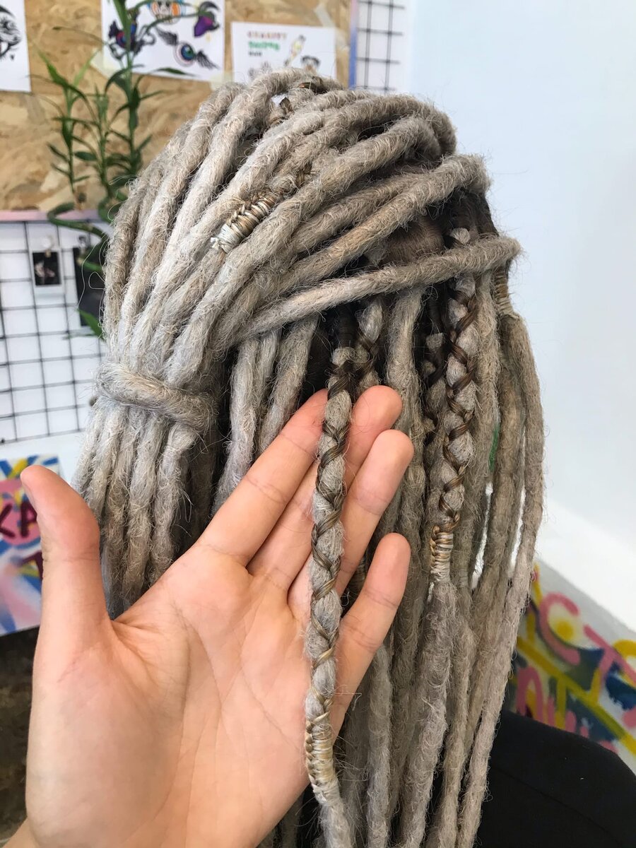Ваши волосы оплетаются вокруг дред растягиваясь по длине. Для такого способа крепления необходимы волосы примерно от 25 см до 50 см, дреды получатся более гибкие, подвижные. Также такой вид вплетения позволяет сделать более плавный переход на контрастных цветах (например, если дреды белые, а волосы чёрные) и служит дополнительным украшением.
