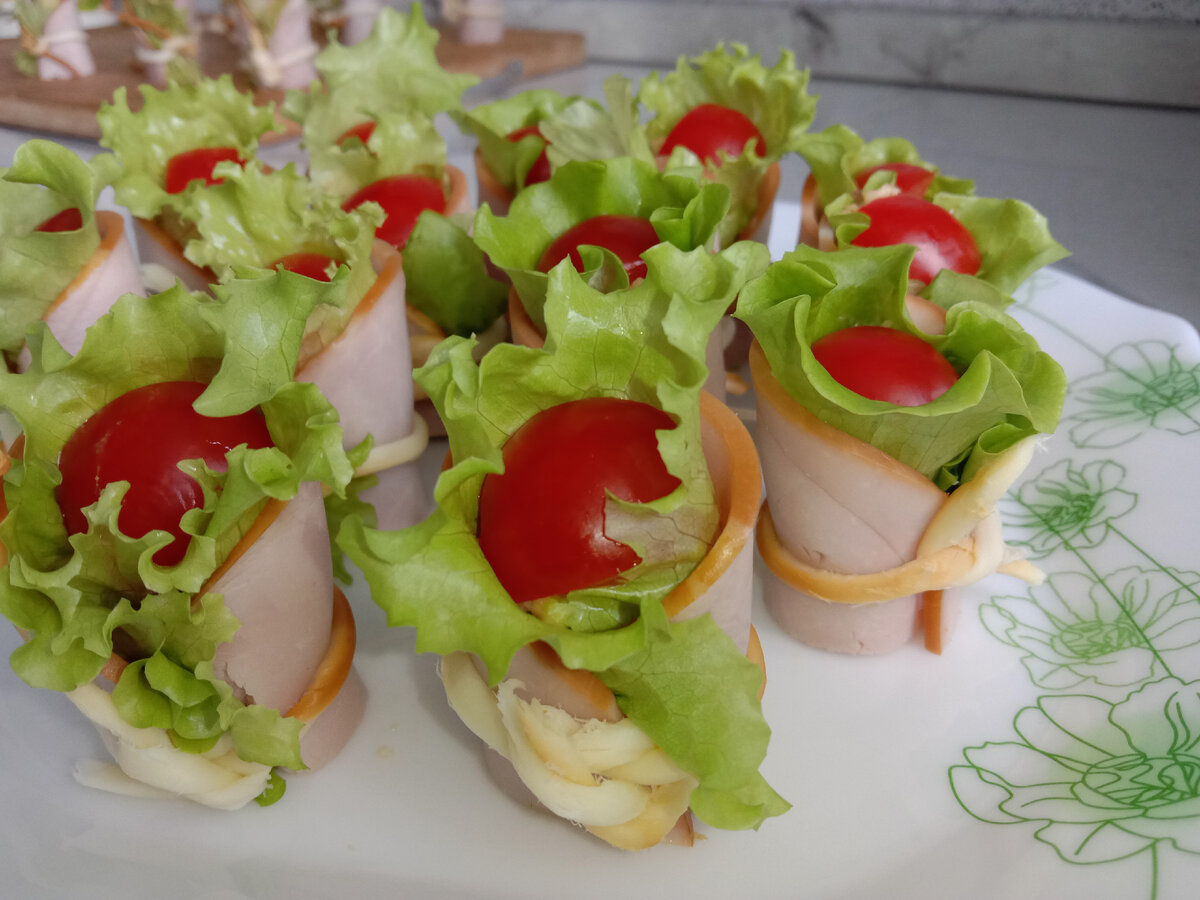 Вот такую прекрасную закуску можно приготовить абсолютно с любой начинкой на ваш вкус. Время приготовления: 30 минут Количество: 18 штук Ингредиенты: Карбонад - 300 грамм Сыр - 200 грамм Чеснок - 2 зубчика Орехи грецкие молотые - 2 столовые ложки (по желанию) Помидоры - 3 штуки Листья салата - 1 пучок Петрушка - по вкусу Сыр косичка - (для связывания) Майонез или соус майонезный - 3 столовые ложки 1. Сыр натираем на мелкой тёрке. Чеснок выдавливаем через пресс. Петрушку нарезаем мелко. Орехи измельчаем ножом. 2. Соединяем сыр, орехи, петрушку и чеснок. Добавляем майонез или, в данном случае сырный соус. Хорошо размешиваем. Солить не нужно. 3. На каждый кусочек карбонада кладём лист салата, на него выкладываем по одной неполной столовой ложке начинки. 4. Сворачиваем карбонад с начинкой в трубочку и завязываем в двух местах нитью из сыра-косички. 5. От помидор нужно отрезать боковинки, и вставить сверху каждой закуски. Получается красиво, вкусно и сытно. Если вам понравился рецепт, став