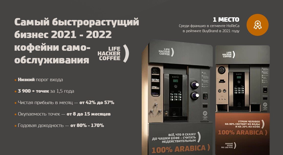 Расскажем на примере Lifehacker Coffee. 3900 открытых кофеен самообслуживания за 1,5 года с чистой прибылью от 42% до 57% и годовой доходностью от 50% до 150%.