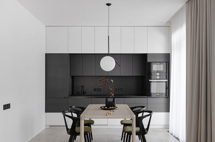 Общее пространство в квартире включает в себя линейную кухню, обеденную группу, зону гостиной и рабочее место.