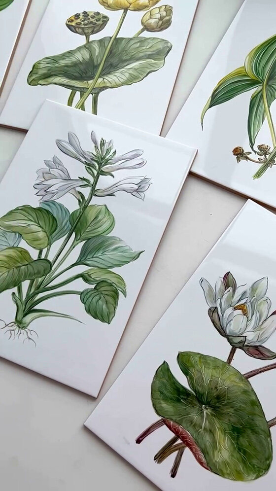 Роспись выполнена на заказ для декора ванной комнаты. 6 больших отдельных плиток 20х30 см. Ботаническая тема - одна из самых любимых. Чем она отличается, к примеру, от цветочной? Ботаническая означает, что речь идет о растениях в живой природе, луговых, полевых, болотных, и переданы они как с натуры, с научной точностью в прорисовке деталей (в качестве образцов - старинные ботанические атласы, гравюры, работы знаменитых художников-ботаников прошлого). Заказчики часто выбирают эту тему для росписи керамической плитки: панно для кухонного фартука, настенное зеркало в ванную комнату. Расписанная плитка может быть оформлена в багет, и вот готовая картина в ванную комнату, которой не страшна влага. Рисунок на плитке не стираемый. Надглазурные краски, муфельный обжиг при 800 С. В росписи посуды сервизов, ботаническая тема тоже очень востребована. Из прошлых работ с болотными растениями - кухонный фартук, панно над варочной панелью. Кухня, для которой предназначалось панно с ботанич