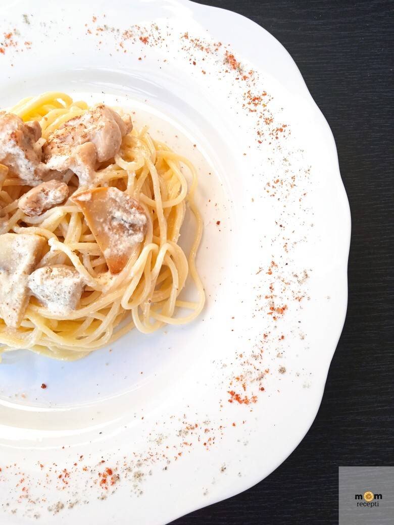 Спагетти в сливочном соусе с грибами и курицей