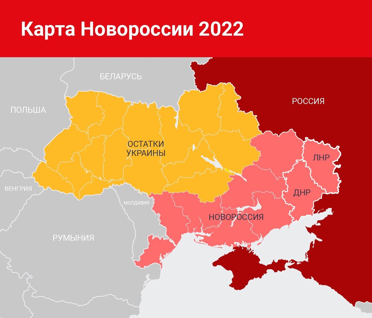 Сейчас уже с трудом вериться, что после окончания специальной операции государственное образование Украина будет существовать. На территории современной Харьковской, Днепропетровской, Запорожской, Херсонской, Николаевской и Одесской областей может быть создано новое государство — Новороссия. В него также могут войти ДНР и ЛНР, однако в данный момент эти два независимых государства хотят войти в состав России.