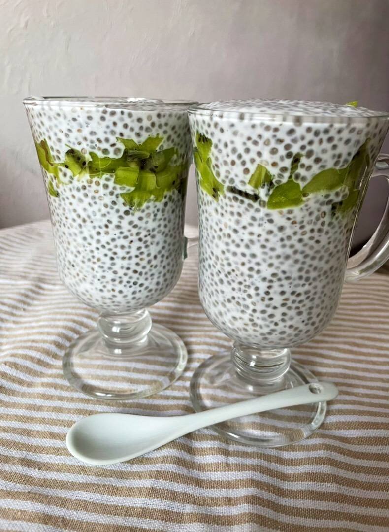 Вкусный, белковый десерт, который можно приготовить с вечера на завтрак. При желании кокосовое молоко можно заменить другим любимым молоком Ингредиенты: Семена чиа, Кокосовое молоко, Киви, Сахар или подсластитель Способ приготовления: Заливаем семена чиа молоком. Оставляем для набухания на 3-4 часа (можно на ночь). Киви нарезаем маленькими кубиками. Добавляем к набухшим семенам сахар или подсластитель. Перемешиваем. Выкладываем часть семян в стакан. Далее выкладываем слой киви. Завершающим слоем выкладываем отставшую часть семян. Десерт готов.