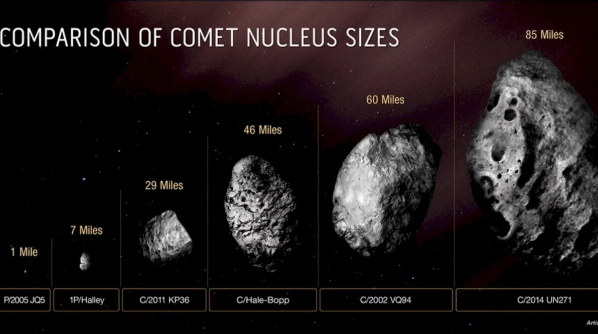 Космический телескоп «Хаббл» определил размер самого большого ледяного ядра кометы из всех, когда-либо виденных астрономами. Он составляет примерно 130 км. Это ядро примерно в 50 раз больше, чем у большинства известных комет. Его масса оценивается в ошеломляющие 500 трлн тонн, что в сто тысяч раз превышает массу средней кометы.