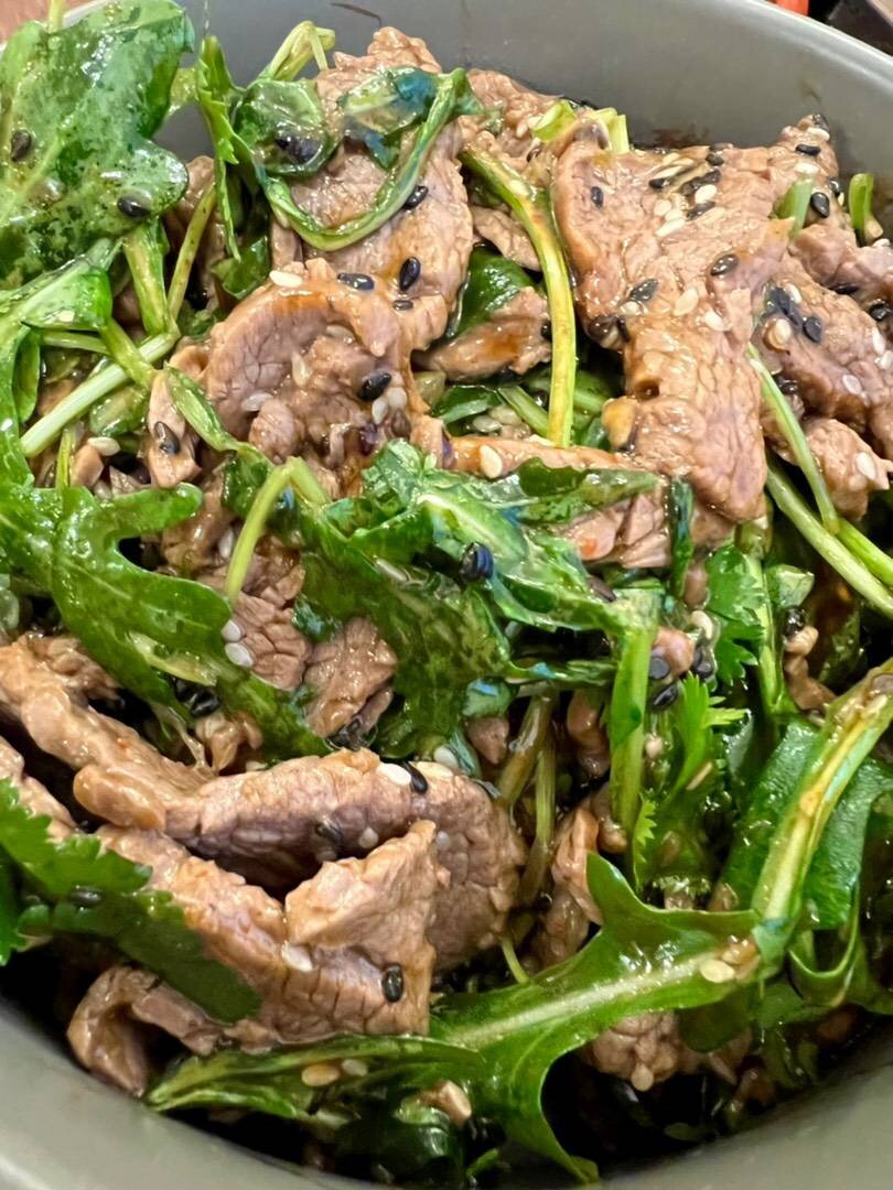 Безумно вкусный салат 👌🏻 Ингредиенты: Говяжья вырезка, Руккола, Кинза, Острый перец свежий или маринованный, Кунжут, Крахмал, Коньяк, Соевый соус, Чеснок, Масло кунжутное или оливковое, Устричный соус, Бальзамический уксус Способ приготовления: Вырезку нарезать тонкими ломтиками. Добавить соевый соус, крахмал, коньяк, если соевый соус концентрированный, то не солите. Размешать и оставить мариноваться на мин 20-30. Бросаем вырезку в кипящую воду и Варим 2-3 мин, достаём. Добавляем чеснок, перец острый или паприку сушеную, если остроты хочется меньше, кунжут, заливаем горячим маслом. Я добавила кунжутное масло. Размешать. Добавить ещё соевый соус, уксус бальзамический, устричный соус (можно найти в китайском отделе в магазине готовую заправку из соевого и устричного соуса), режем острый свежий или маринованный перец кружочками, кинзу режем и все хорошо перемешать. Салат готов.