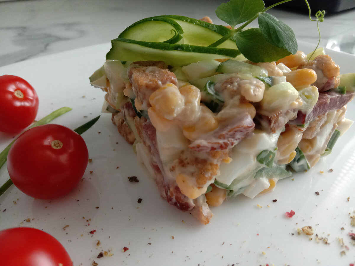 Этот простой салат можно приготовить как к праздничному столу, так и в обычный день. Он не только вкусный, ароматный, но и питательный. Готовится легко и просто. Время приготовления: 30 минут Количество: 6 порций Ингредиенты: Яйца варёные - 3 штуки Огурец - 1 штука Кукуруза консервированная - 100 грамм Карбонад - 200 грамм Сухарики - 50 грамм Лук зелёный - по вкусу Соль - по вкусу Майонез - 4 столовые ложки 1. Нарезаем вареные яйца небольшими кубиками. Свиной карбонад, или колбаску зернистую, нарезаем полосочками. Один огурец также нарезаем брусочками. Зелёный лук нарезаем мелко. 2. Добавляем в салат кукурузу, сухарики и майонез по вкусу. Солить необязательно (есть солёные сухарики). 3. Хорошо размешиваем салат. По желанию можно добавить зелень петрушки. Приятного аппетита!!! Если вам понравился рецепт, ставьте лайк 👍. Подписывайтесь на мой канал, чтобы не пропустить ещё больше простых, вкусных и интересных рецептов блюд, которые будут радовать вас и вашу семью каждый день.