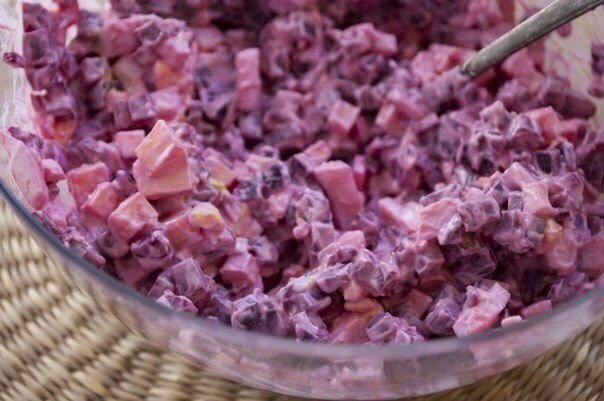 Салат свекольный Легкий свекольный салатик, совсем несложный приготовлении, порадует как на будничном столе, так и на праздничный его можно приготовить, украсив при подаче. Вам потребуется: Свекла 300 г Яйцо куриное 2 шт Сыр твердых сортов 80 г Майонез 3 ст.л. Соль 1 щеп. Смесь перцев 1 щеп. Как готовить: 1. Для приготовления салата нужны: отварная свекла (темно-бордовая, сладкая), отварные яйца, сыр твердый, немного майонеза, соль и пряности по вкусу. Салат в приведенной интерпретации является достаточно нейтральным по вкусу. Его можно разнообразить, если добавить: - немного измельченного чеснока; - нарезанный кубиками маринованный огурчик; - толченые грецкие орехи; - смешанный с горчицей майонез. 2. Очищенную отварную свеклу нарезать небольшими кубиками, поместить в салатник. 3. Сыр и очищенные яйца нарезать также небольшими кубиками. Добавить их в салатник к свекле. 4. Посолить салат, заправить майонезом, приправить пряностями по вкусу. 5. Перемешать салат. Подавать можно сра
