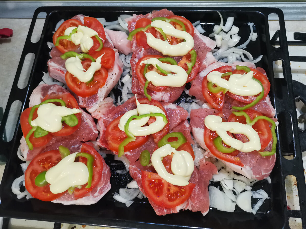 Покупаем корейку на кости, в магазине часто есть в продаже уже разрезанная порционно, ещё нам понадобятся: репчатый лук, томаты, болгарский перец, майонез, сыр, сол и молотый перец. 1. Берём противень, смазываем его растительным маслом. Нарезаем полукольцами две больших луковицы и выкладываем их на противень, делаем "подушку", затем выкладываем мясо, солим и перчим по вкусу, выкладываем нарезанные кольцами томаты и немного болгарского перца. Поливаем немного майонезом каждый кусочек сверху. 2. Ставим в разогретую до 200 градусов духовку на 50 минут, по истечении этого времени посыпаем понемногу каждый кусочек натёртым на крупную тёрку сыром и ставим обратно в духовку ещё на 10 минут. 3. Дополняем гарниром по вашему желанию. Приятного аппетита! Буду рада отзывам и комментариям. Критику выслушаю тоже!
