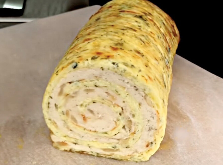 Очень красивый, солнечный и легкий в приготовлении куриный рулет. Ингредиенты : Сыр твердый — 300 гр Яйца — 3 шт Сметана — 3 ложки Куриная грудка — 500 гр Лук — 1—2 шт Соль, перец, сухая зелень Приготовление :