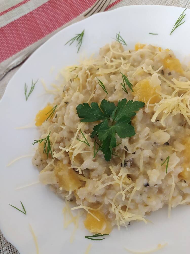 #веган #ризотто #рис #тыква #сыр #сливки 1 ст = 250 мл Ингредиенты: бурый рис (можно белый), тыква (в очищенном виде), репчатый лук (некрупный), чеснока, растительные сливки, веганский твёрдый сыр (или другой на Ваш вкус), ст.л растительное рафинированное масло, Соль по вкусу, Чёрный перец по вкусу, ч.л итальянские/прованские травы или 1/3 ч.л розмарин Способ приготовления: Если у Вас бурый рис, то замочите его в кипятке на 1,5 ч. Затем отварите в соотношении 2:1 вода-рис на медленном огне, я варила без крышки. Воду берите горячую. Если рис у Вас обычный белый, то отварите его в таком же соотношении обычным способом. Лук и чеснок мелко нарезать. Обжарить на масле на сковороде на медленном огне под крышкой 2 мин. Нарезать очищенную тыкву некрупными кубиками, добавить к луку, перемешать и тушить 5 мин. Добавить соль и специи, перемешать. Добавить рис к овощам. Если белый, то сразу влейте сливки и готовьте под крышкой 5 мин. Если бурый, то добавьте ещё 1/2 ст воды и потушите до её испарен