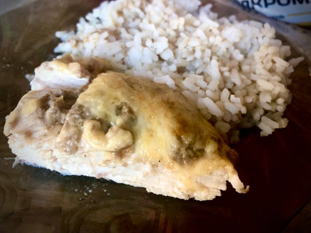 Ингредиенты: Куриное филе , Лук, Шампиньоны , Сметана , Соевый соус , Сыр, Оливковое масло, Соль, перец Способ приготовления: Куриное филе разрезать вдоль, положить на противень, немного посолить. Лук и шампиньоны произвольно порезать, обжарить на капле масла, потом взбить погружным блендером, немного подсолить. В грибную смесь добавить сметану, соевый соус, сушёный чеснок, перец и немного соли, хорошо перемешать и залить филе. Запекать под фольгой 30 минут. В конце посыпать тертым сыром и запекать без фольги ещё 10 минут. Куриное филе готово😉.