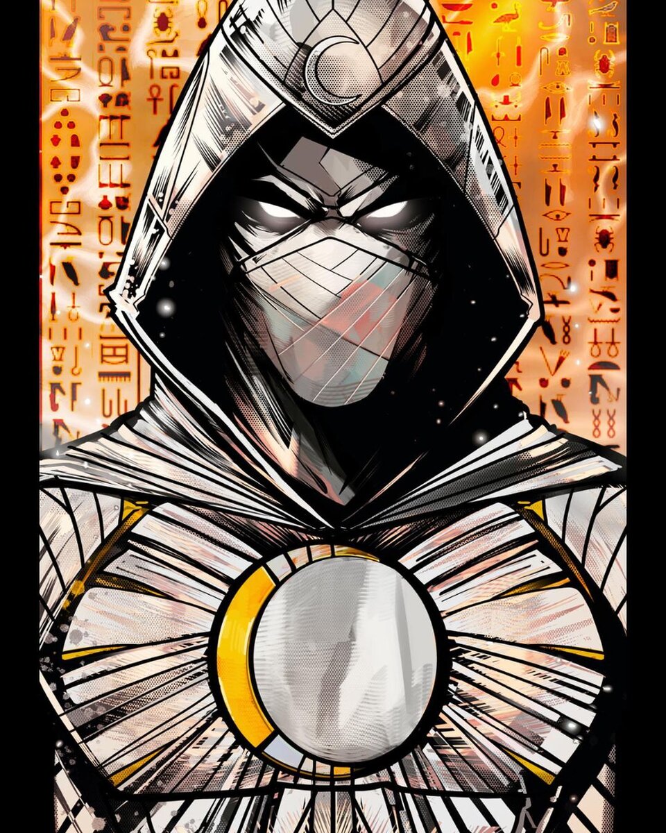 На артах художник изобразил Лунного Рыцаря и Мистера Рыцаря. Костюм последнего был показан, когда тело контролировал Стивен. А классический костюм Лунного Рыцаря носит Марк. Сериал "#ЛунныйРыцарь " продолжает выходить на сервисе "Disney+". #сериалы