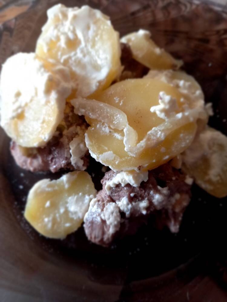Когда хочется побыстрее сбежать с кухни, но и приготовить что-то вкусненькое, сытное и на всю семью, я использую вот этот рецепт. Мне нравится в нём всё: вкусно, быстро и полноценное второе! Ингредиенты: Мясо: гуляш из свинины , Картофель , Лук репчатый , Соль , Майонез Способ приготовления: Промыть и обсушить бумажными полотенцами гуляш. Поместить в миску и залить соевым соусом. Поместить в холодильник на 2 часа. Пока мясо в холодильнике, почистить лук. Вымыть и почистить картофель. Нарезать лук кольцами, а картофель кружочками. Через 2 часа вынуть из холодильника, слить соевый соус и выложить мясо на противень. Можно мясо доставать из миски и слегка отжимать, не сливая соевый соус. Посолить. Следующий слой - лук кольцами. Распределить по всей поверхности мяса. Сверху выложить картофель, порезанный кружочками. Посолить. Смазать майонезом. Накрыть фольгой и поместить в разогретую заранее духовку на 50 мин. при температуре 180 градусов. Вытащить из духовки по прошествии времени. Подават