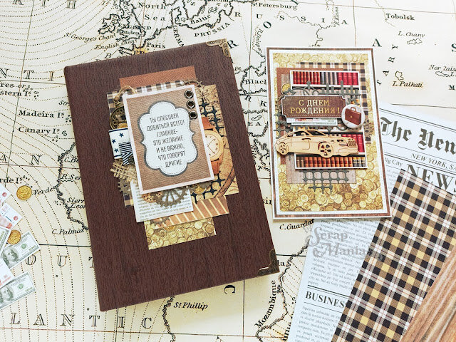 Всем привет! Сегодня вас вдохновляет Катя Завгороднева. Вот и я добралась до нашей мужской новинки этого года - коллекции "Мужчина на миллион", и решила сделать брутальную шкатулку-"книгу" в кожаной обложке, а в дополнение к ней поздравительную открытку. В прошлом году я уже имитировала таким же способом книгу, но тогда это была шкатулка побольше и оформлена как книга заклинаний. В этот раз тема совсем другая и размер шкатулки более удобный и похожий на небольшую книгу почти А5 формата, даже муж чуть не взял полистать, подумал, что это альбом или блокнот)) а потом сказал "О, да тут надо пистолет хранить, как в кино!" :) На самом деле при выборе размера я больше ориентировалась на высоту, чтобы шкатулку можно было использовать как замену купюрнице. Обложку я делала из переплётного картона, который оклеила кожзамом с текстурой под дерево. На обложке в качестве главного элемента я использовала тканевую карточку "Мужчина на миллион. Ты способен", которую приклеила на пивной картон и украс
