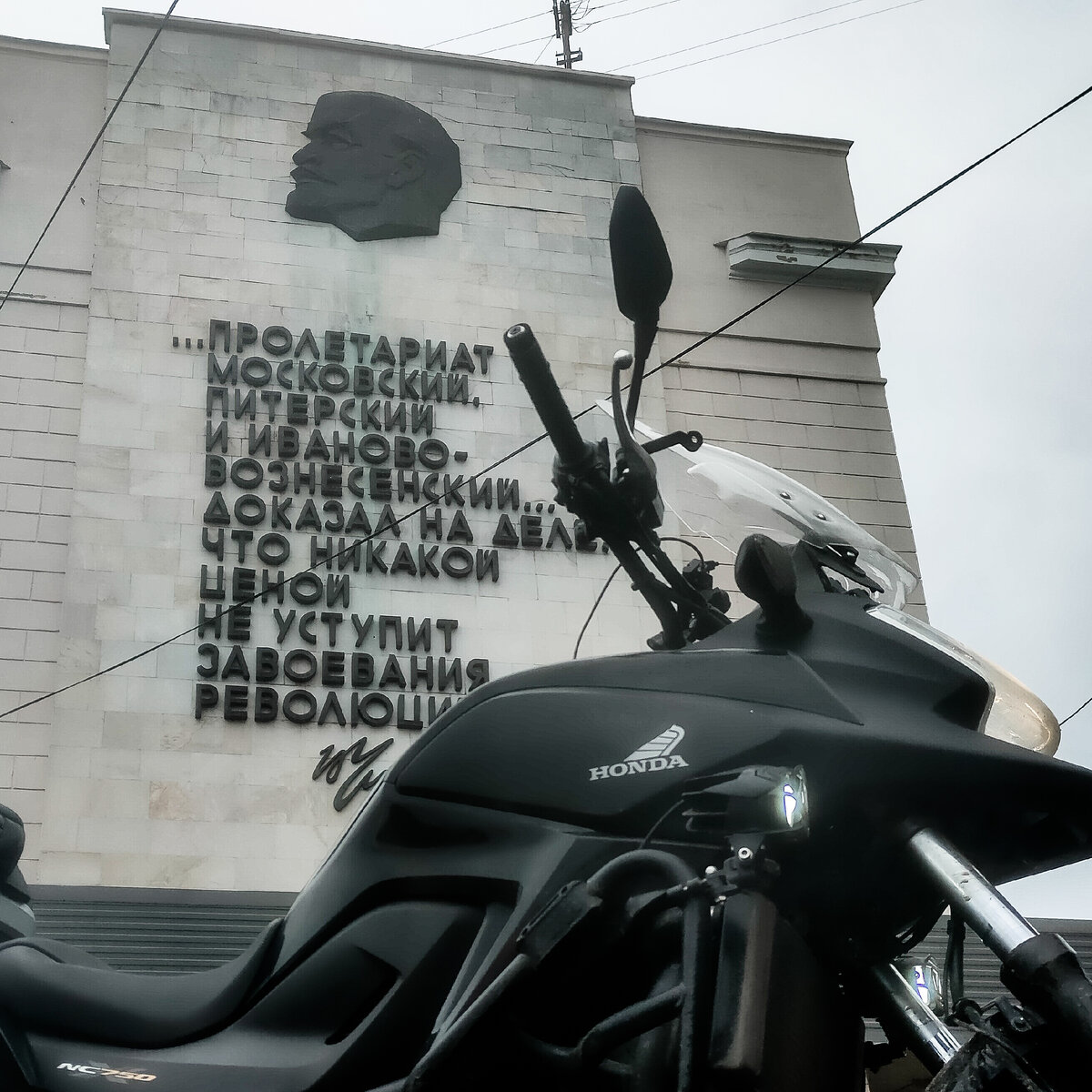 На въезде в Иваново стоит стелла "Иваново-Вознесенск". Рассмотрение подобных артефактов в историческом контексте вызывает улыбку. Село Иваново существовало очень давно. Историки датируют его первое упоминание аж XVI веком. С течением времени вокруг села появлялись слободы, которые в 1853-м году объединили в Вознесенский посад. Спустя 18 лет посад и село объединяются в город Иваново-Вознесенск и с 1871 по 1932-й год, то есть 61 год место было известно именно под таким названием. И, несмотря на то, что уже 90 лет город называется именно Иваново, есть отдельные энтузиасты, которые считают, что именно старое название самое правильное. Причем энтузиасты такого уровня, что готовы согласовать целую стеллу на федеральной трассе. Годы жизни Ильича пришлись на единственное название населенного пункта и потому для него он был и остался Иваново-Вознесенском. Цитата, размещенная на здании ивановского Дома Советов, относится к выступлению Ленина на III съезде рабочих текстильной промышленности. Поск