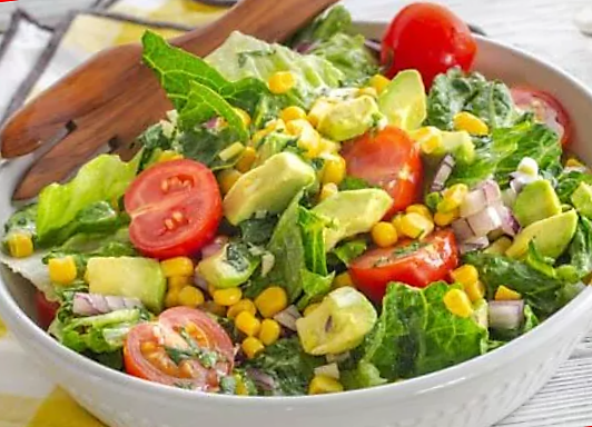 Салат с кукурузой и авокадо Витаминный салат из овощей и авокадо приправленный зеленью Ингредиенты: 2 початка вареной кукурузы, 2 помидора, 1 огурец, 1 лимон, половина апельсина, рукола для украшения 1 авокадо, свежесмолотый черный перец, соль кладем по вкусу, 2 ч.л.дижонской горчицы, 10 г. сливочного масла, Приготовление: 1. В сковороде с антипригарным покрытием, растапливаем сливочное масло и обжариваем со всех сторон кукурузу 3-4 минуты, острым ножом срезаем с одного початка зерна. 2. Разрезаем авокадо вдоль пополам, удаляем косточку и снимаем кожуру. Мякоть авокадо нарезаем небольшими кубиками. Помидоры и огурец промываем и нарезаем ломтиками. 3. Для приготовления заправки: выжимаем сок из половины лимона и половины апельсина. Соединяем сок с дижонской горчицей, солью и перцем и тщательно перемешиваем 4. В большой миске соединяем кукурузу и авокадо, помидорами и огурцами, поливаем заправкой и перемешиваем. 5. Оставшуюся половину лимона нарезаем дольками. Выкладываем салат н