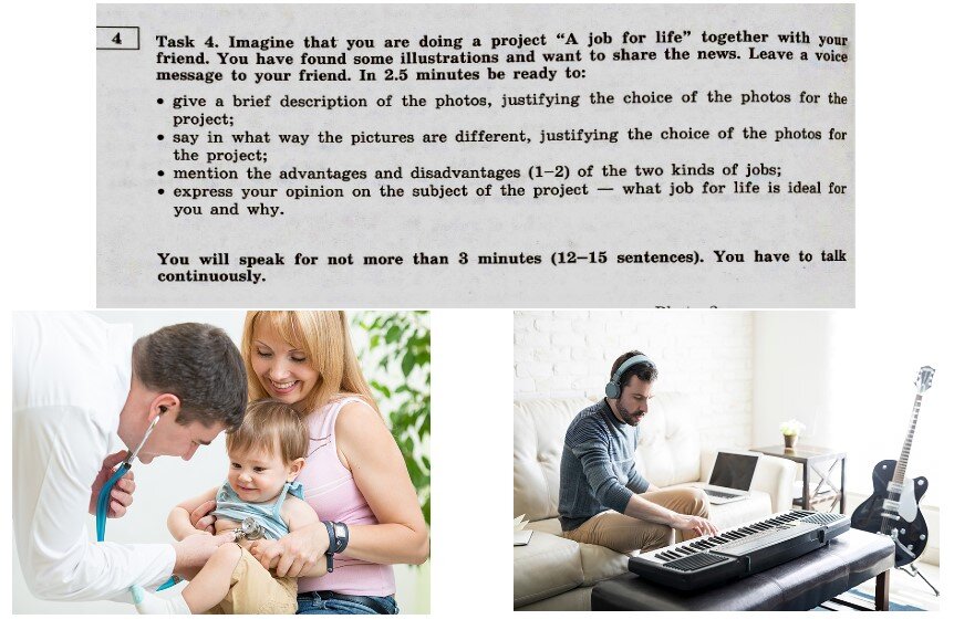 Пример монологического высказывания Аудио-озвучку этого примера можно прослушать ЗДЕСЬ. Hi Kate, how are you doing? I have found some marvellous illustrations for our project “A job for life” and I’d like to tell you a couple of words about them. I have chosen these pictures because they perfectly illustrate our project. In the first one there is a pediatrician and a smiling mum holding her kid. The doctor is conducting a medical check-up. The second photo depicts a musician who is working from home. He is surrounded by musical instruments and his laptop which he definitely needs for his work. Obviously, there are some distinctions between the pictures. The key difference is that being a doctor implies working in a hospital, a сlinique or at least a medical office, while a job of a musician, presented in the 2nd picture, can be done remotely, for example from home. Apart from that, in the first picture we can see that a doctor is a profession which needs communicating with people and b