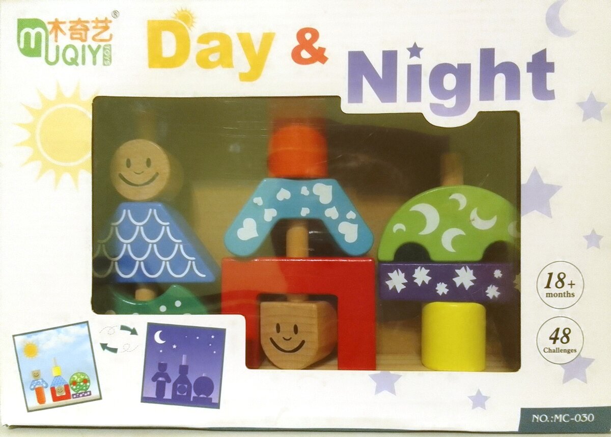 О пользе деревянных головоломок сказано немало. Они экологичны, безопасны, достаточно эстетичны. Одной из самых популярных на сегодняшний день является игра «День и ночь», которая существует в нескольких версиях. В сети есть немало обзоров на игрушку бренда «Bondibon», мы же хотим познакомить вас с китайским аналогом. Причина выбора последнего многими родителями донельзя прозаична: цена оригинала не всегда приемлема для семейного бюджета. Давайте рассмотрим её особенности. В набор входит деревянная платформа с тремя колышками, 10 цветных деталей с отверстиями для нанизывания на колышки и буклет со схемами сборки головоломки. Если оригинальная версия имеет возрастную маркировку «от 3 до 6», то её китайский клон рассчитан на детей от полутора лет, что, пожалуй, ближе к истине: многие родители сетуют, что их трехлетки, одаренные сей недешевой игрушкой, часто забрасывают ее сразу после распаковки. Правда, нам известны и счастливые исключения, когда ребенок подключает фантазию и пользуется