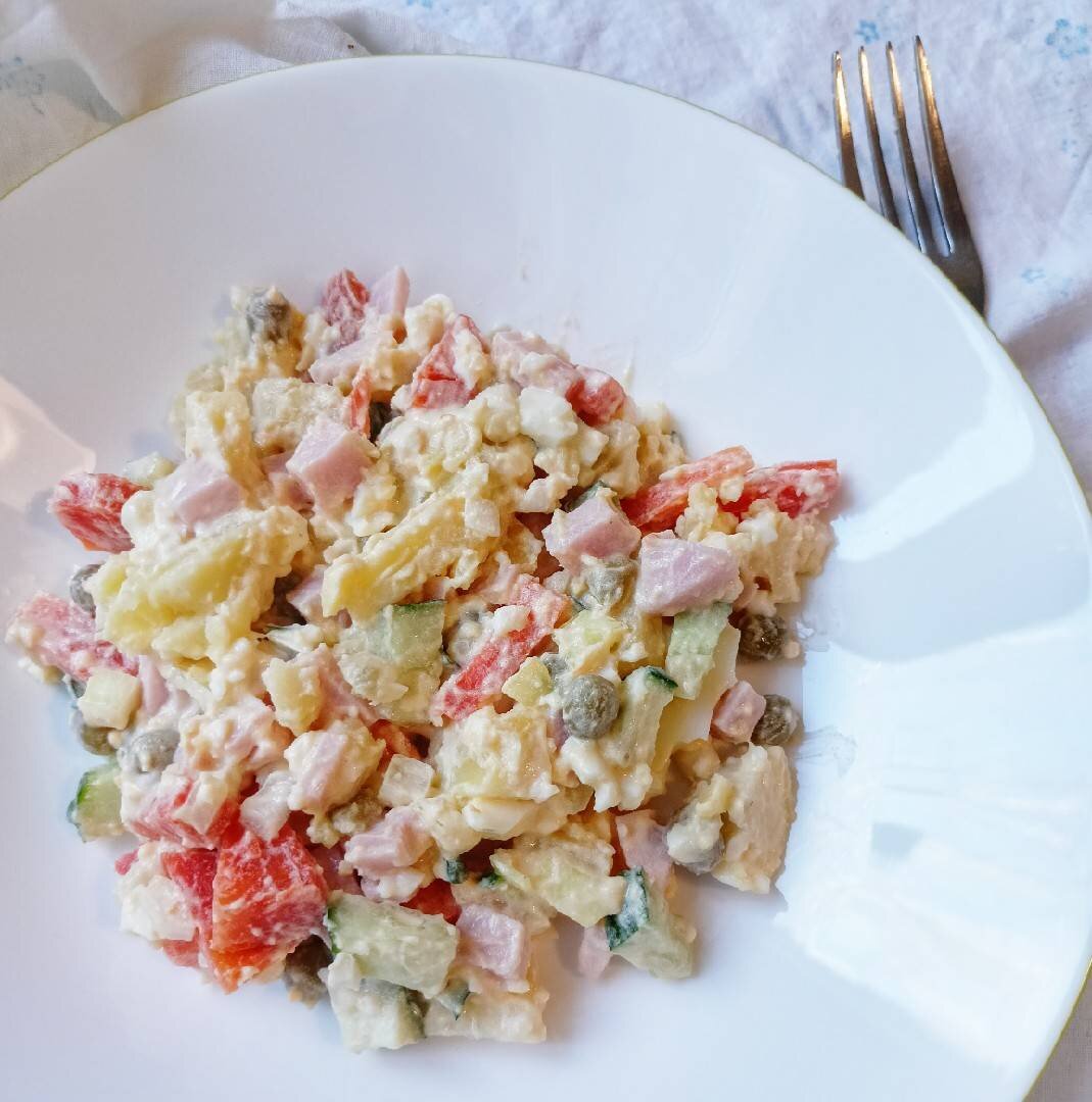 Нежный и вкусный салат! Нравится он, как перекус. Очень хорошо идёт на семейные праздники 🤗 #пп #салат #зож #оливье #меню #рекомендую #вкусно Ингредиенты: Картофель отварной (крупный), Морковь варёная (большая), Огурец свежий (средний), Ветчина нежирная (у меня империя вкуса из индейки) , Лук репчатый , Яйца варёные (с0), Горох зелёный , Заправка:, Сметана 10% , Горчица русская , Соль Способ приготовления: Предварительно отварить овощи и яйца. Овощи делаю на пару, а яйца просто варю. Помыть и очистить овощи. Мелко нарезать в миску. Яйца очистить от скорлупы и размельчить их. Добавить к картофелю и моркови. Чистый огурец мелко нарезаем и добавляем к салату. Также делаем с луком. И ветчиной. Добавляем горох и всё перемешиваем. Делаем заправку: Смешиваем сметану с горчицей и солью, перемешиваем и добавляем её в салат. И можем насладиться этим шедевром🤗 Приятного аппетита 🤗