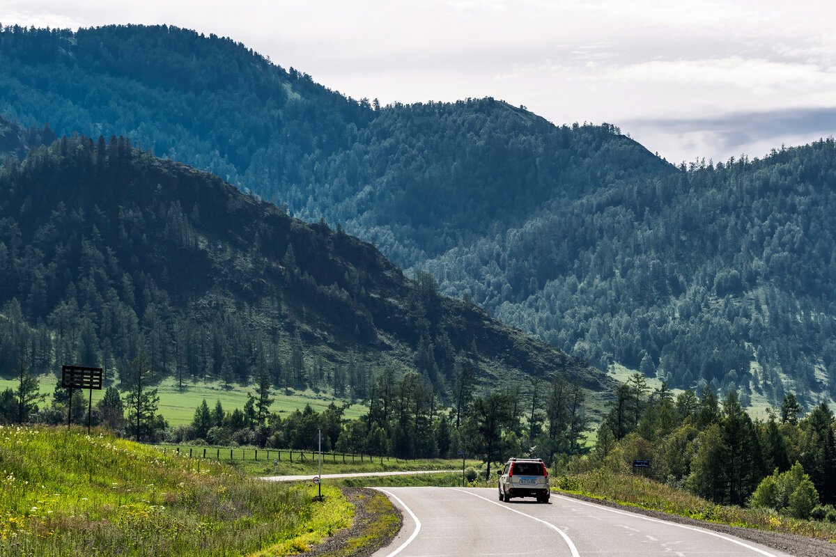 Республика Алтай. Двигаясь уже какой час по Чуйскому тракту увидели эту маленькую речушку с красивым названием Еловый ключ. Спускаясь с гор, она пересекает дорогу. Решили остановиться, размять ноги, умыться, перекусить. Пробежался по окрестности, сделал несколько фотографий. Место живописное и действительно присутствуют ели вперемешку с лиственницами. Вокруг склоны гор поросшие хвойной тайгой, а перед ними луга с высокой травой. Для коров, коих в Алтае не мало, сытное место. Наверняка здесь заготавливают сено. Таким богатством окраина Алтая под Монголией не изобилует как здесь. Июль, пик лета, всё залито зеленью. Немного отдохнув, поснимав отправляемся дальше в дорогу. # река Еловый ключ # горный алтай # республика алтай # чуйский тракт # природа # пейзаж # путешествия # достопримечательности # дорога # лето # отдых # авто путешествия # фотография # сибирь # автор фотографий: Евгений Мухортов. Река Еловый ключ, Чуйский тракт, республика Алтай. 13 июля 2019 год