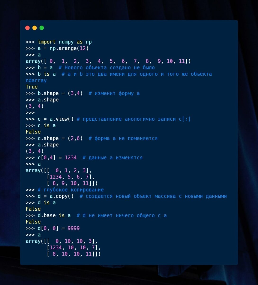 Ранее мы упоминали про такую проблему со списками, когда при присваивании новой переменной и последующем изменении изначальный список тоже меняется. Такая же ситуация происходит и в numpy. По умолчанию мы не создаем новый объект, а лишь передаем ссылку на него. Поскольку Numpy более гибкий, то и инструментов у него больше: Представление (поверхностное копирование) и глубокое копирование. Представление - позволяет как угодно изменять форму, но при изменении данных меняются данные и у изначального массива. Можно получить через срез. Глубокое копирование - создается новый объект, который не имеет ничего общего со старым (кроме набора данных, но хранятся они уже в разных ячейках памяти) #numpy